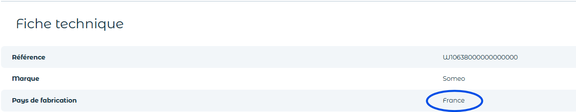 Le pays de fabrication est précisé dans la fiche technique de chacun de nos produits au niveau de la ligne "Pays de fabrication" :