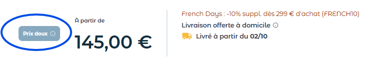 Les prix doux sont signalés par un petit rectangle bleu "PRIX DOUX" à proximité du prix de vente sur nos fiches produits :